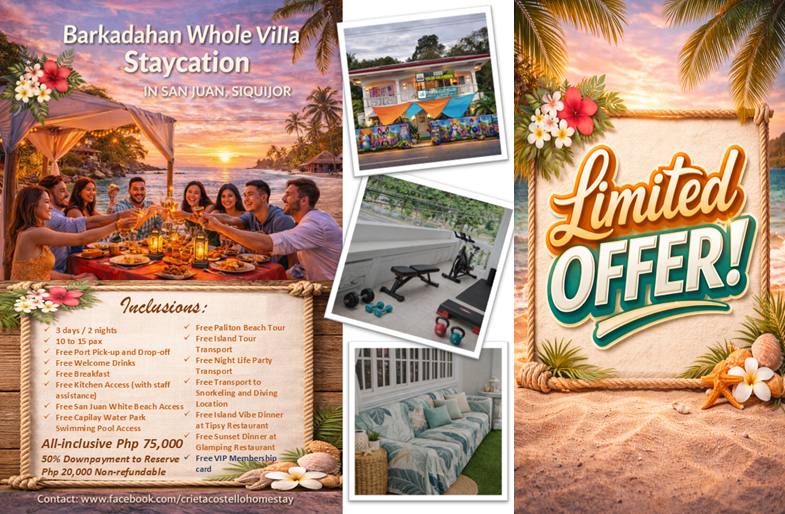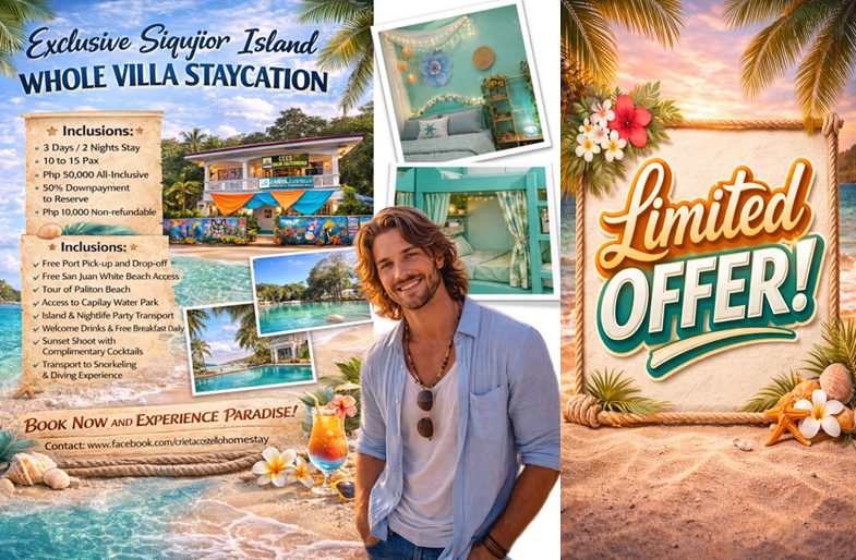 This package includes a 3-day, 2-night stay in the entire villa for 10 to 15 guests, featuring 5 bedrooms: 3 double deluxe rooms with private bathrooms and 2 dormitory rooms with shared bathrooms. Daily breakfast is included. Transport services are provided for port pick-up, island tours, and port drop-off. Access to the white beach and swimming pool is free. A sunset photoshoot with complimentary drinks is also included. The package features three complimentary meals for 15 pax—the Island Vibe dinner at Tipsy Restaurant, the Asian-style dinner, and the lunch at Glamping Restaurant. For guests who wish to go snorkeling or diving, free transport to the activity location is also available.