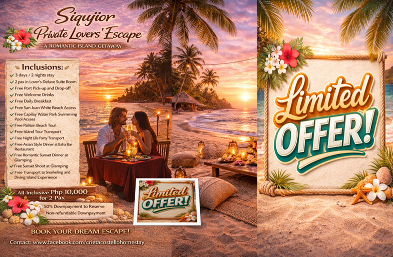 This package includes a 3-day, 2-night stay in our Lover’s Deluxe Suite Room within the villa, perfect for up to two guests. Daily breakfast is included. Free transport services are provided for port pick-up, island tours, and port drop-off. Guests also enjoy free access to the white beach and swimming pool. The package features two complimentary dinners for two—one at Baha Bar, serving Asian-inspired cuisine, and another at Glamping Sunset Village, offering a romantic dining experience. For guests who wish to go snorkeling or diving, free transport to the activity location is also available.